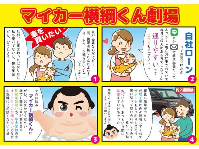 愛知名古屋の自社ローンは中川区自社ローンマイカー横綱くんへ!新保証プラン登場!半年間、距離無制限の保証で更にお車をお買いやすく!車検・整備・鈑金等、車のことならなんでも当社にお任せください!
