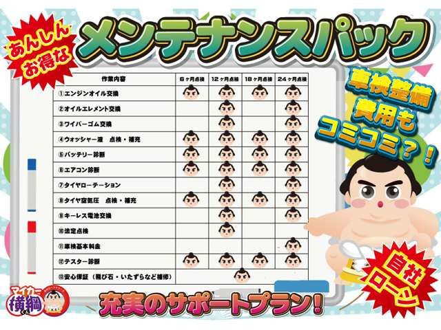 愛知名古屋の自社ローンは中川区自社ローンマイカー横綱くんへ!新保証プラン登場!半年間、距離無制限の保証で更にお車をお買いやすく!車検・整備・鈑金等、車のことならなんでも当社にお任せください!